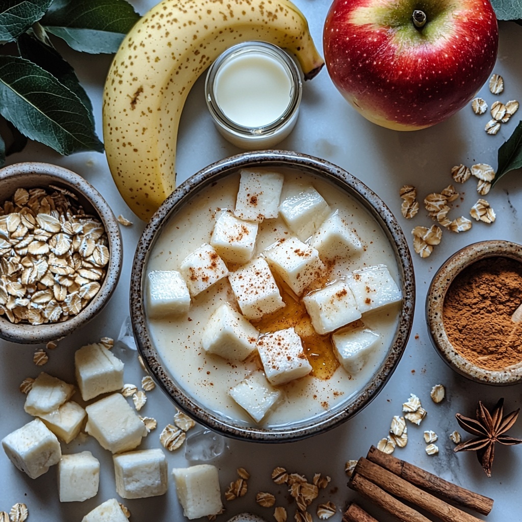 Next, toss in the chopped apple, ripe banana, your choice of milk, creamy Greek yogurt, oats, sweetener, vanilla extract, cinnamon, nutmeg, and ice cubes if using. Having these ingredients measured and ready makes blending quick and fun.