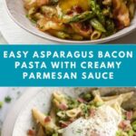 To take this Asparagus and Bacon Pasta Recipe to the next level, garnish it with additional freshly grated parmesan or a sprinkle of chopped parsley for an added pop of color and flavor. If you included eggs, place a poached egg on top to add a luscious, velvety richness that invites you to break the yolk over the pasta.