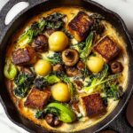 This baked gnocchi dish combines tender gnocchi with sautéed leeks and Brussels sprouts, all enveloped in a creamy parmesan sauce and topped with a crispy breadcrumb crust. It’s a comforting, flavorful meal perfect for a cozy dinner.