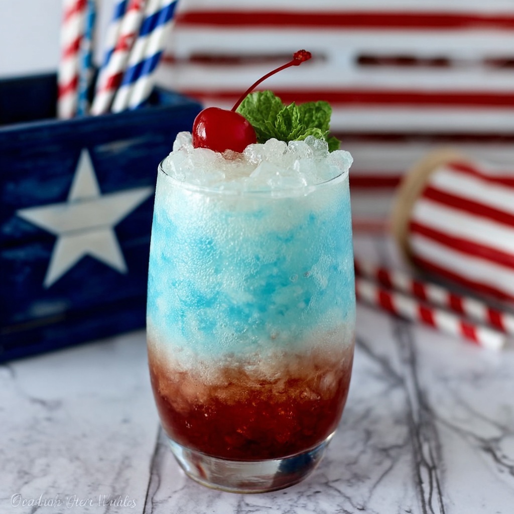 The American Cocktail is a vibrant and refreshing mixed drink featuring peach vodka, blue curacao, and a splash of cherry grenadine, perfectly topped with creamy coconut cream. This easy-to-make cocktail is served chilled in a tall glass, offering a delightful balance of fruity flavors and creamy texture.