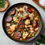 This Cajun Chicken and Sausage Gumbo is a hearty, flavorful stew that captures the essence of Louisiana cooking. Featuring a rich, dark roux, aromatic vegetables, tender chicken, smoked sausage, and fresh okra, this gumbo simmers to perfection with traditional Cajun spices. Served over fluffy rice, it’s an comforting meal perfect for family dinners or entertaining guests.