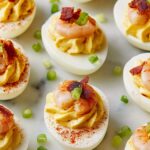 Sprinkle a pinch of Cajun seasoning on top, scatter fresh chopped chives, and add a bit of crumbled bacon for crunch and smoky flavor. Don’t forget to gently nestle one perfectly cooked shrimp atop each egg half as your grand finishing touch. Your Cajun Shrimp Deviled Eggs Recipe is now ready to dazzle!