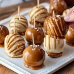 To enjoy warm caramel apple pretzel bites, pop them in a low oven around 200 degrees Fahrenheit for a few minutes until just warmed through. Be gentle to avoid melting the white chocolate drizzle too much, preserving their beautiful appearance.