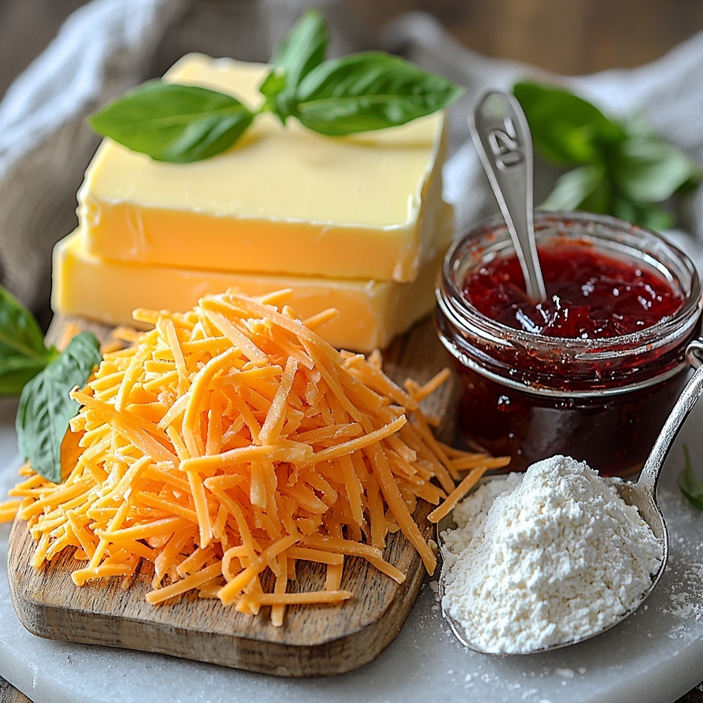 To whip up these Cheesy Thumbprint Appetizers with Hot Pepper Jelly Recipe, you only need a handful of simple ingredients, each playing a crucial role in delivering the perfect balance of flavor and texture. From rich butter to sharp cheddar, every component is thoughtfully chosen to create a harmonious bite.