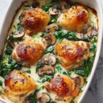 This low-carb oven-baked dish combines tender chicken breast pieces with sautéed spinach and mushrooms, enriched with creamy heavy cream and topped with a golden blend of mozzarella and Parmesan cheeses. It’s a hearty, healthy, and flavorful meal perfect for anyone looking for a delicious, protein-packed dinner that’s easy to prepare.