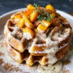 Delight in these crispy churro waffles coated in cinnamon sugar, perfectly paired with a luscious peaches and cream sauce. This breakfast favorite combines the sweet, spiced crunch of churro coating with fresh fruit and creamy textures for a delicious brunch treat.