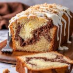 12. Swirl the Cream Cheese: Use a knife or skewer to gently swirl the cream cheese filling into the batter, creating an attractive marbled effect throughout the loaf.