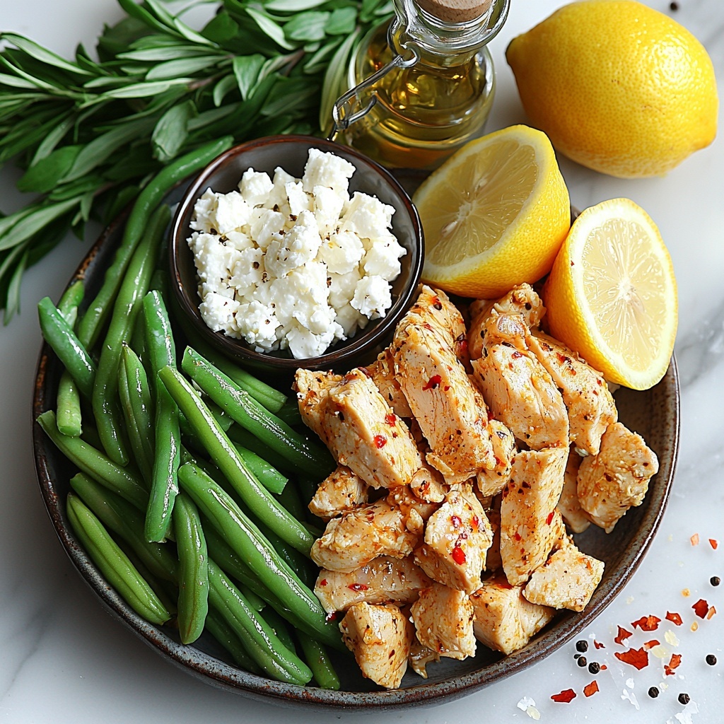 A vibrant and creamy Coconut-Lemon Chicken Alfredo featuring tender chicken breast strips simmered in a zesty coconut milk and lemon sauce, complemented by a spicy chili feta cream. Served alongside crispy parmesan-roasted green beans, this dish offers a delightful fusion of Mediterranean and tropical flavors in just 30 minutes.