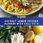 - Make the coconut-lemon Alfredo sauce: Using the same skillet that cooked the chicken, sauté the minced garlic over medium heat until fragrant, about 1 minute. Pour in the remaining coconut milk, fresh lemon juice, and lemon zest. Bring to a gentle simmer and cook for 3 to 5 minutes until the sauce slightly thickens. Stir in the prepared chili feta cream and adjust seasoning to taste, adding extra salt or pepper if needed.