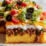 This Cornbread Taco Bake combines the comforting flavors of cornbread with a hearty taco filling, layered with sour cream and cheese for a creamy, cheesy finish. Perfect for a crowd-pleasing dinner, it blends ground beef seasoned with taco spices, Mexicorn, and Rotel for a zesty twist. Topped with fresh green onions and served with classic taco garnishes like lettuce, olives, tomatoes, and taco sauce, this casserole is an easy, flavorful, and satisfying meal.