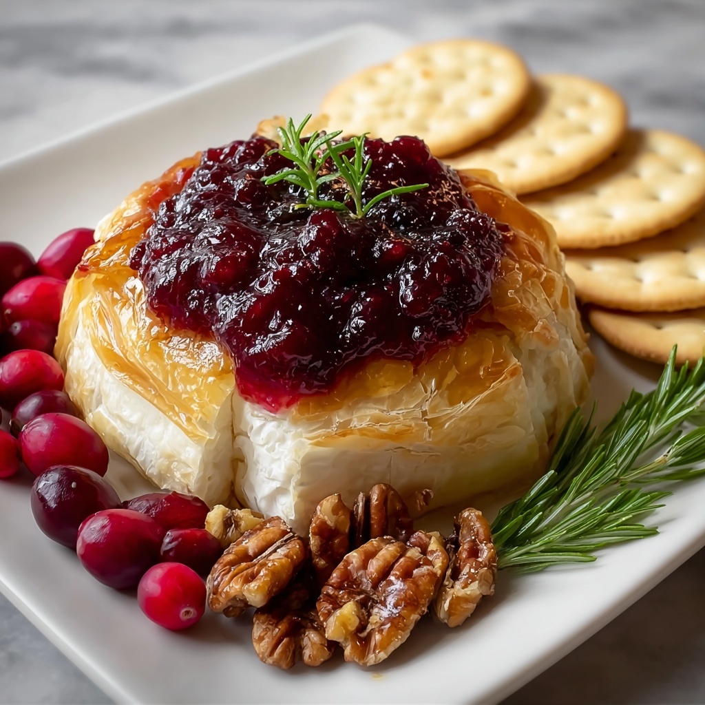 A delightful appetizer featuring creamy Brie cheese topped with tangy cranberry sauce and crunchy pecans, all wrapped in flaky puff pastry and baked to golden perfection. Perfect for holiday gatherings or special occasions.