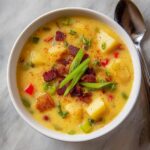 This creamy Cajun potato soup is a hearty and flavorful dish featuring tender potatoes, aromatic vegetables, and a kick of Cajun seasoning. Blended to a smooth consistency and enriched with heavy cream and butter, this comforting soup is perfect for a cozy meal, garnished with crispy bacon and fresh green onions for added texture and taste.