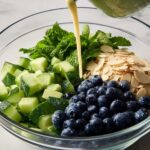 Pour your freshly made dressing over the cucumber, blueberry, almond, and mint mixture. Use a large spoon or salad tongs to toss everything gently but thoroughly so that every bite is coated with the bright vinaigrette. You can serve the salad immediately to enjoy the crisp textures or refrigerate it for a chilled version that lets the flavors meld beautifully.