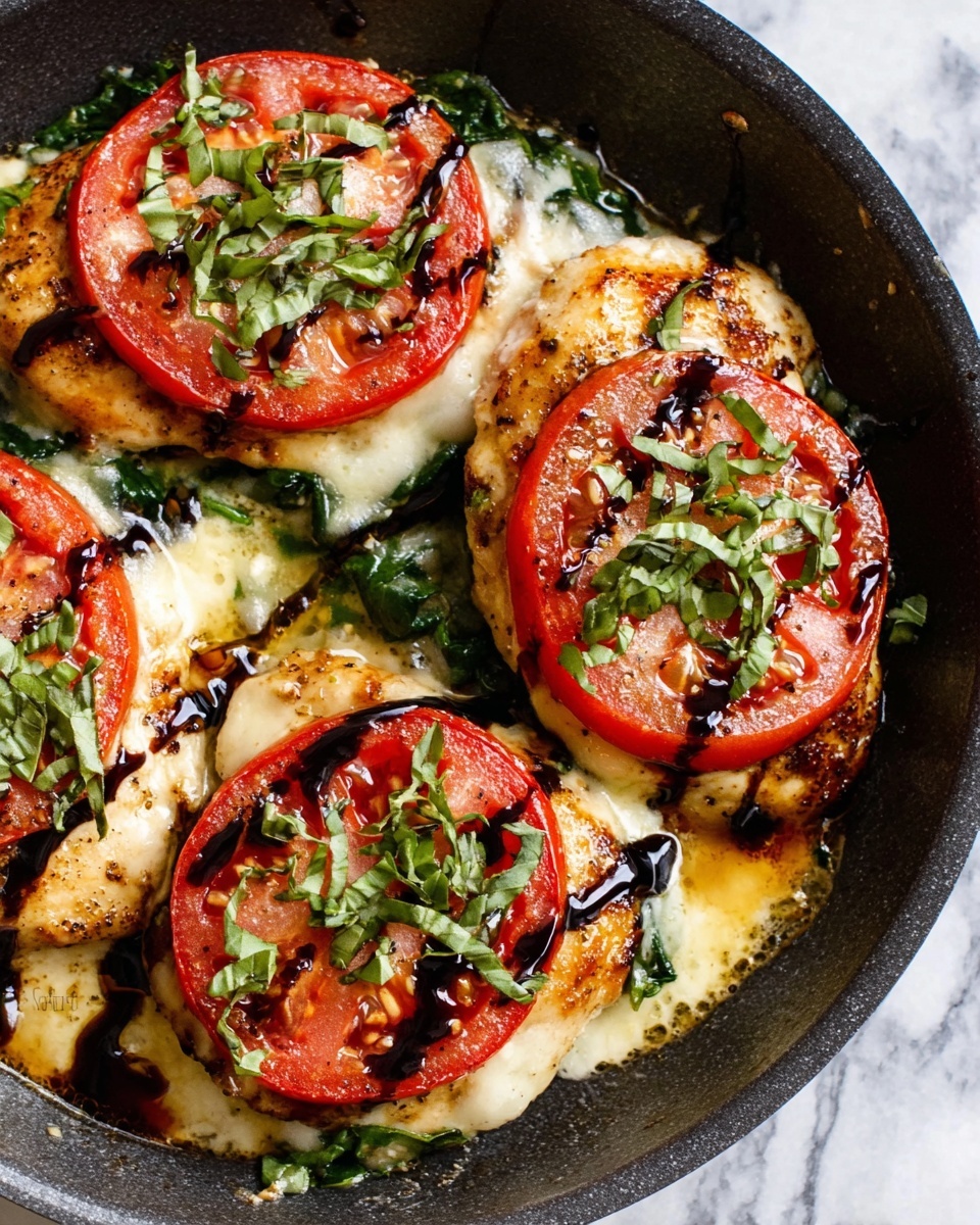 - Finish and Serve: Remove the skillet from the oven. Top each chicken piece with tomato slices, torn fresh basil, and drizzle balsamic glaze generously (about a teaspoon per piece). Serve immediately with the spinach and pan juices. Adjust seasoning with salt and pepper as needed.
