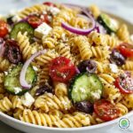 A refreshing and vibrant Easy Italian Pasta Salad featuring tricolor rotini, crisp cucumber, juicy cherry tomatoes, tangy feta cheese, and sliced black olives, all tossed in zesty Italian dressing. Perfectly chilled, this salad is a delightful side dish for summer picnics, barbecues, or any casual gathering.