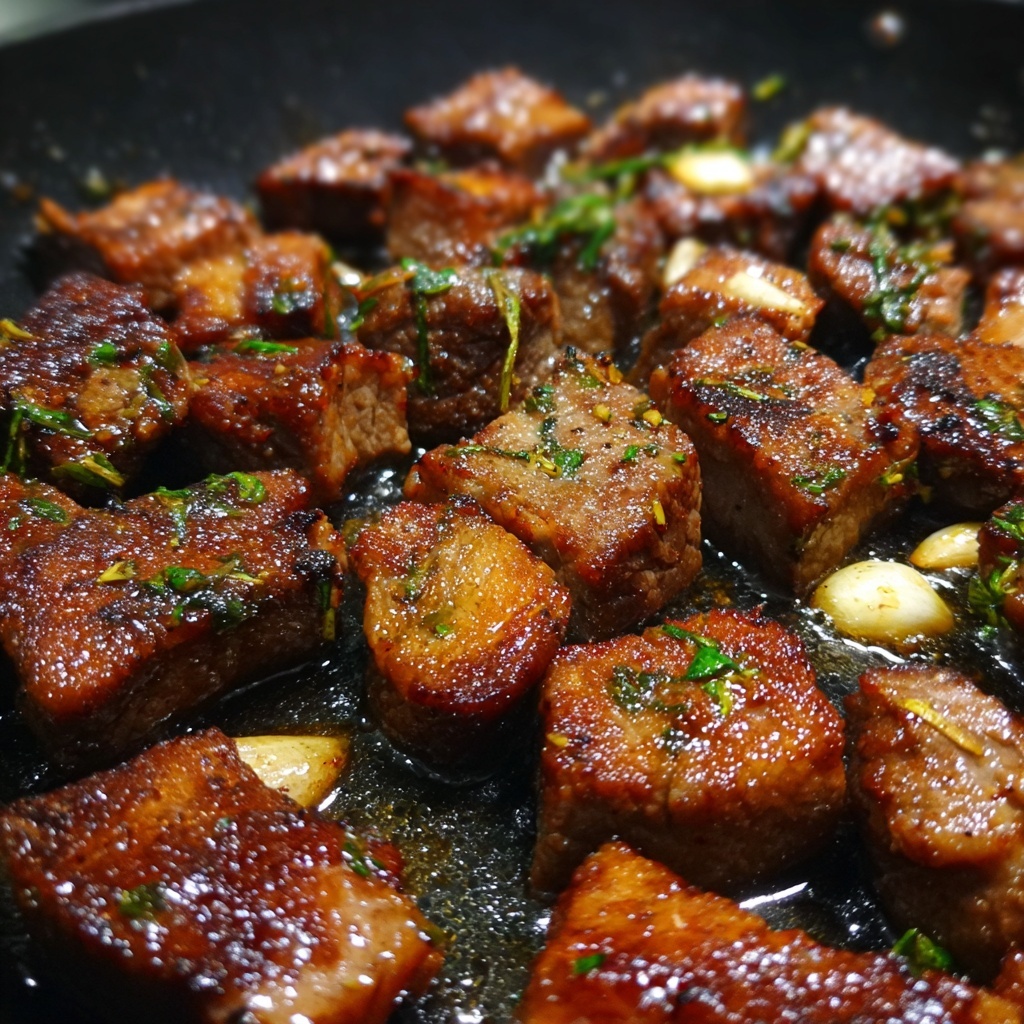 - Finish: Return the seared steak bites to the skillet with the garlic butter. Toss gently to coat all the pieces evenly in the butter and garlic. Serve immediately, garnished with chopped parsley if desired for a fresh herbal note.