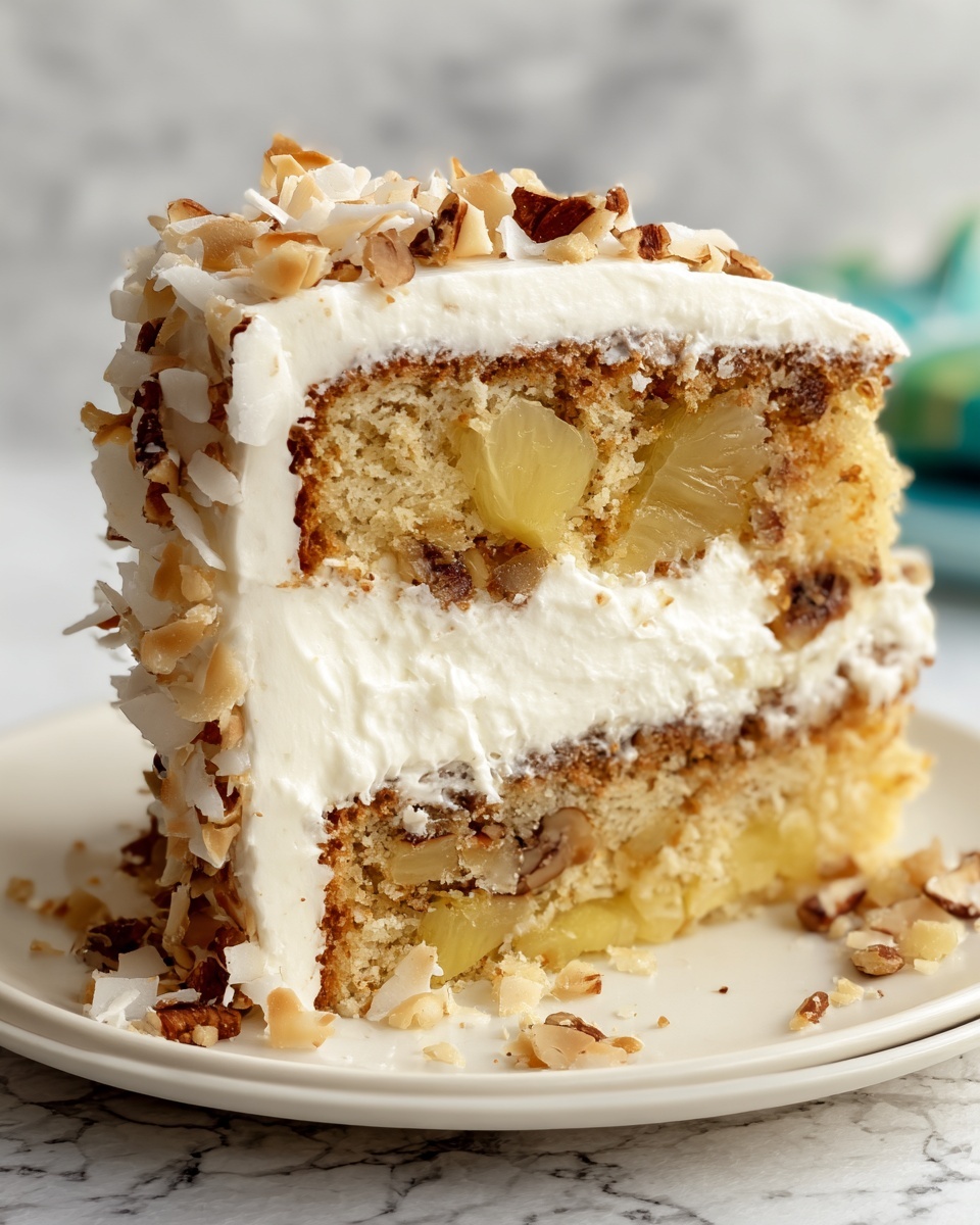 Garnishing with additional shredded coconut and macadamia nuts is a wonderful way to highlight the cake’s tropical roots. You can also add a few fresh pineapple slices or edible flowers to create a presentation that excites both the eyes and the palate.