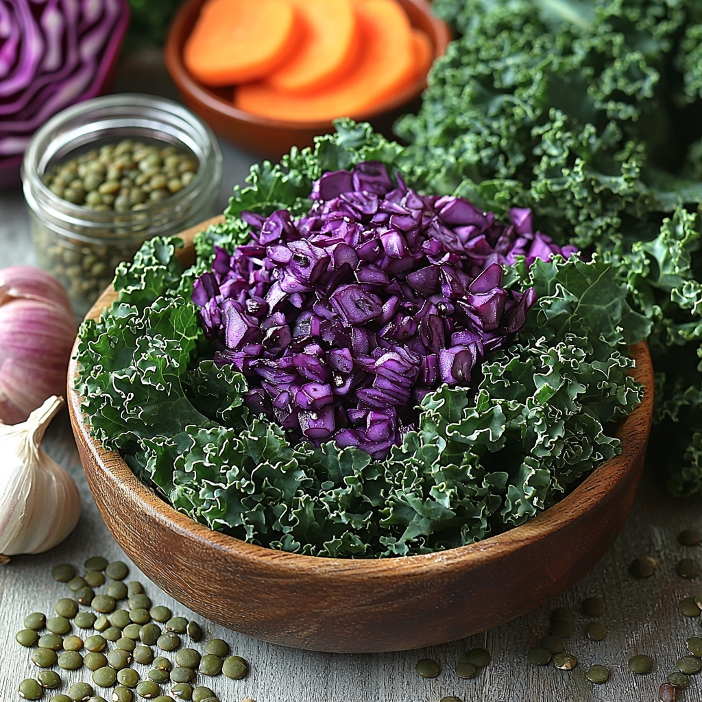- Sauté Vegetables: Heat olive oil in a large saucepan over low heat. Add the chopped kale, chopped red cabbage, green onions, and minced garlic. Sauté for about 3 minutes until the vegetables are slightly wilted but still vibrant.