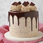 - Assemble the Cake: Place one cake layer on a serving plate. Spread a generous layer of the cream cheese frosting over it. Add the second cake layer on top and frost the entire cake with remaining cream cheese frosting. Pour the chocolate ganache over the cake, allowing it to drip down the sides naturally. Decorate the top with chopped pieces of 2 large Hershey chocolate bars, 6 mini Hershey bars, and sprinkle chocolate sprinkles for a beautiful finish. Chill for at least an hour before serving to set the frosting and ganache.