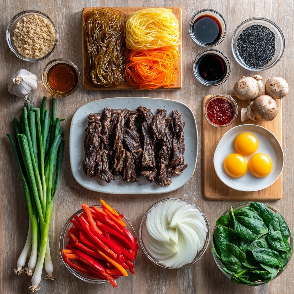 Japchae is a classic Korean dish featuring glass noodles stir-fried with marinated beef and a colorful variety of sautéed vegetables. This recipe balances savory, sweet, and slightly spicy flavors with a glossy sesame oil finish, perfect for a satisfying and vibrant meal.
