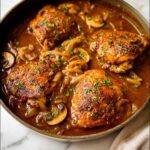 This classic French-inspired Chicken Chasseur recipe features tender, juicy chicken thighs and drumsticks simmered in a rich, flavorful sauce made with mushrooms, onions, garlic, brandy, white wine, tomato paste, and beef stock. Finished with fresh tarragon and a touch of butter, it’s perfect served alongside creamy mashed potatoes, rice, or small pasta for a comforting and elegant meal.