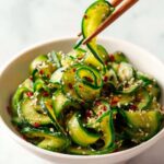 This Korean Cucumber Salad is a refreshing and tangy dish perfect for a quick side or snack. Thinly sliced cucumbers are marinated in a zesty blend of soy sauce, garlic, chili oil, and rice vinegar, delivering a delightful balance of spicy, sweet, and savory flavors with a satisfying crunch.