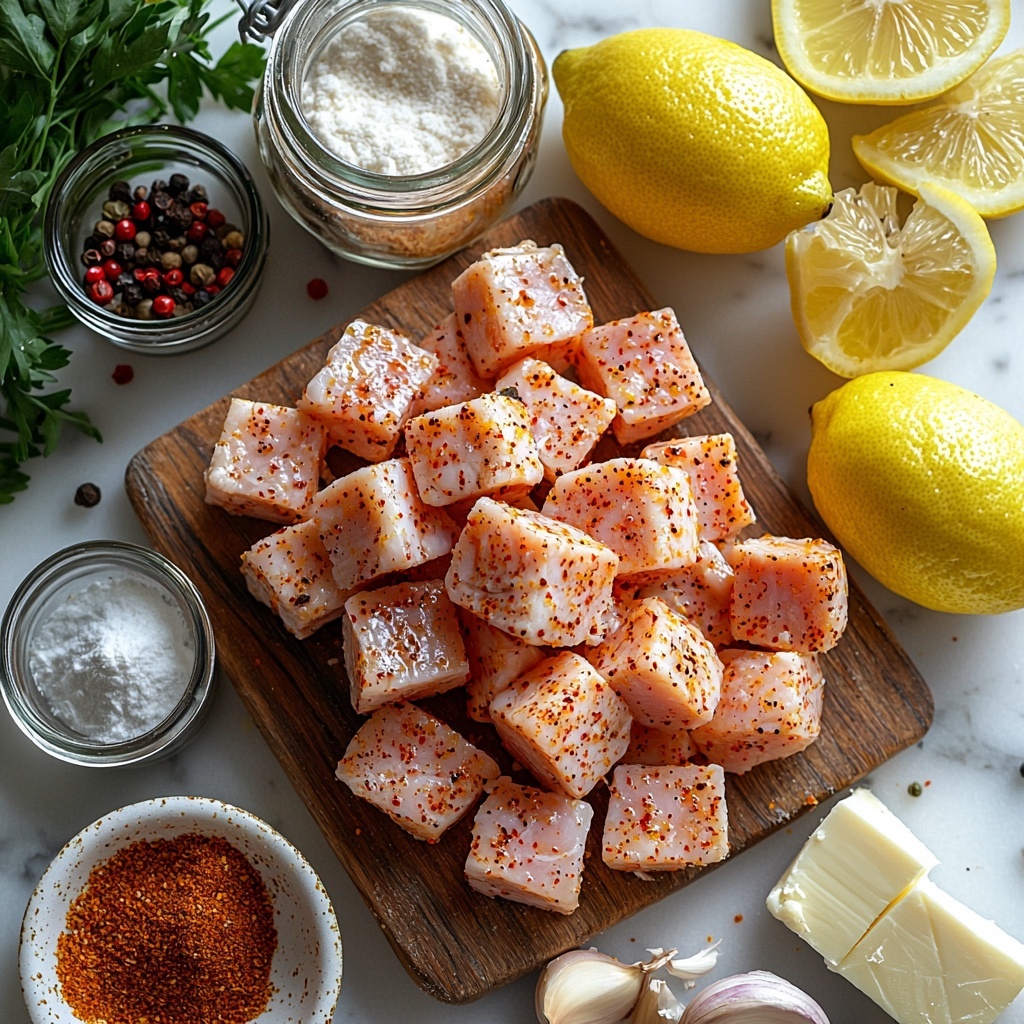 Start by cutting your chicken breasts into bite-sized pieces and patting them dry, which helps the coating stick better. In a bowl, combine the lemon juice, lemon zest, kosher salt, black pepper, garlic powder, and onion powder to create a vibrant marinade. Toss the chicken bites in this mixture until every piece is perfectly coated, then let it rest for about 10 minutes to soak up those bright, zesty flavors.