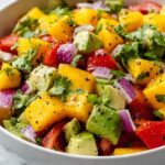 A vibrant and refreshing Mango Avocado Salad featuring a tangy lime dressing with a hint of honey, garlic, and chili. This colorful salad combines juicy mangoes, creamy avocados, crunchy red pepper, and fresh herbs for a perfect light meal or side dish.