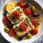This Mediterranean Baked Cod with Olives is a flavorful and healthy dish featuring tender cod fillets baked with a vibrant mix of cherry tomatoes, kalamata olives, garlic, and lemon slices. Seasoned with oregano and red pepper flakes, this recipe offers a perfect balance of Mediterranean flavors that are easy to prepare and perfect for a weeknight dinner or special occasion.
