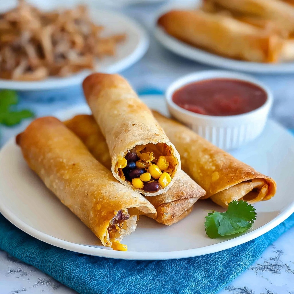 These Mexican Spring Rolls, also known as egg rolls, are a delicious and easy-to-make appetizer or snack featuring a flavorful blend of pulled pork, cheese, corn, black beans, and spices wrapped in crispy spring roll wrappers. Baked to golden perfection and served with a tangy enchilada dipping sauce, they bring a savory Mexican twist to a classic favorite.