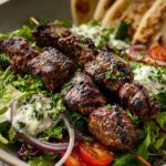 Remove the kebabs from the grill, slide them off the skewers, and layer them onto the warmed flatbreads. Top with a generous helping of the fresh salad, and if you like, add a dollop of cooling yogurt or tahini sauce to elevate the flavors even further.