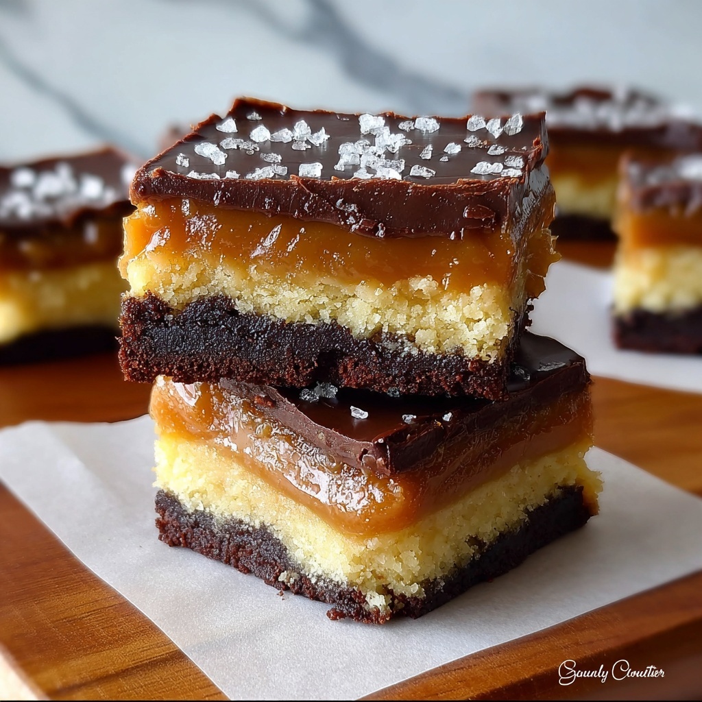 Millionaire Brownies are a decadent layered treat featuring a buttery shortbread crust, rich fudgy brownies, and a silky chocolate ganache topping, all finished with a sprinkle of flaky sea salt for an indulgent twist.