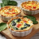 Mini Veggie Quiches are a delicious and easy-to-make snack featuring a flaky pie crust filled with a savory mixture of eggs, cheddar cheese, and sautéed vegetables. Perfect for breakfast, brunch, or a light bite, these bite-sized quiches combine fresh spinach, bell peppers, and onions for a flavorful and colorful treat.