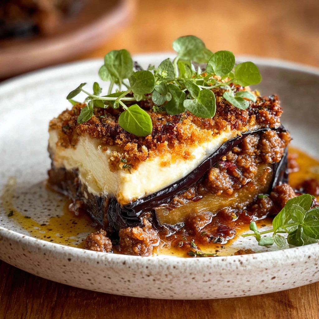 - Assemble and Bake: Preheat oven to 180°C (350°F). In a baking dish, layer half of the eggplant slices evenly. Spread half of the meat sauce on top. Add the remaining eggplant slices as a second layer, then cover with the remaining meat sauce. Pour the béchamel sauce evenly over the top layer, smoothing it out. Sprinkle the panko breadcrumbs over the béchamel for a crunchy topping. Bake for about 30 minutes or until the top is golden and bubbly. Let it rest 10-15 minutes before serving.