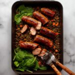This one-pan baked sausage & lentils recipe combines hearty pork sausages with flavorful French lentils, sautéed shallots, garlic, and cumin seeds in a savory chicken broth. Baked until the sausages are perfectly browned and the lentils tender, it’s a comforting, saucy, and simple meal requiring minimal cleanup.