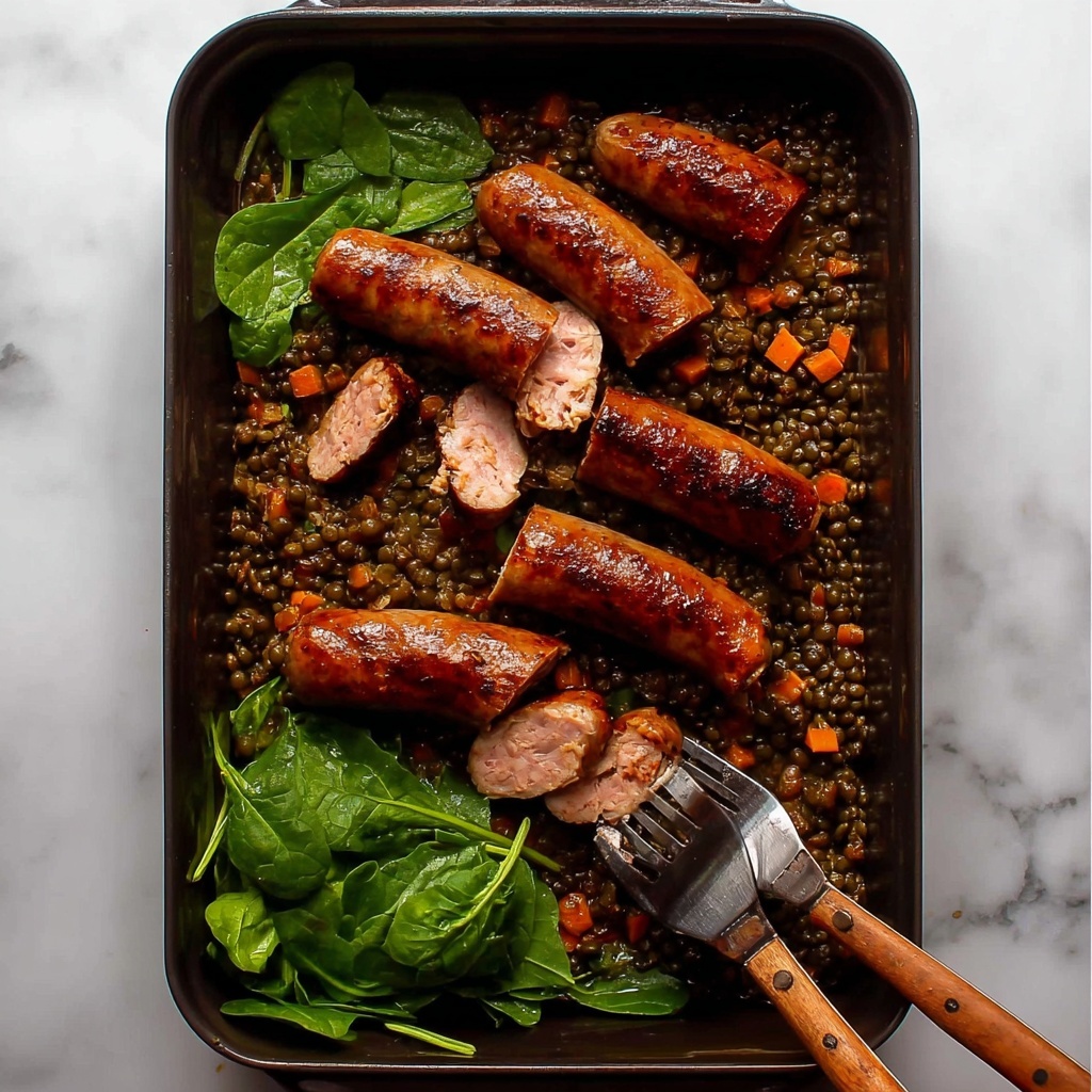 - Serve: Plate the sausages with the lentils, which form a rich, saucy base acting as the sauce for the dish. Optionally serve with baby spinach dressed with a simple vinaigrette.