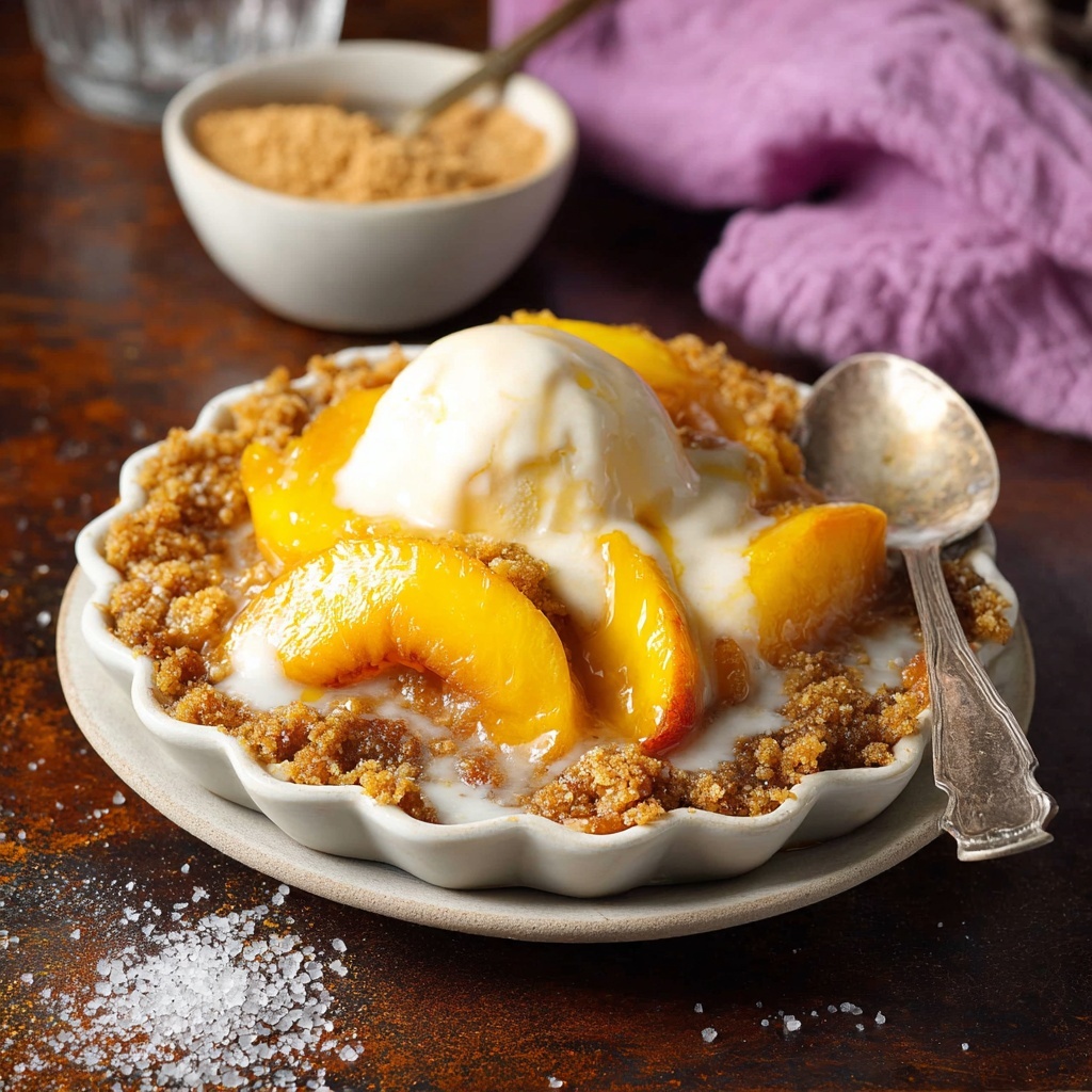 Serving this peach crisp with a scoop of creamy vanilla ice cream elevates it instantly—imagine warm peaches meeting cold, smooth ice cream. A simple sprig of fresh mint adds a pop of color and refreshing aroma that complements the rich flavors.