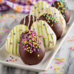 - Dip the Eggs in Chocolate: Using two forks, carefully dip each peanut butter egg into the melted chocolate, coating it evenly. Gently shake off excess chocolate and place back on the lined baking sheet. If desired, immediately decorate with Easter sprinkles while the chocolate is still wet.