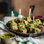 4. Serve with Green Sauce: Arrange the cooked meatballs on a serving platter and generously drizzle or serve alongside the Peruvian Green Sauce for dipping. This vibrant sauce adds a fresh, tangy, and spicy complement to the savory meatballs.