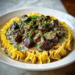 Plate the stroganoff by layering the tender beef and creamy sauce over the warm, buttered noodles. Sprinkle chopped fresh parsley on top for a fresh, colorful finish. This simple garnish brightens the dish and adds an inviting aroma that will make it impossible to wait for that first bite.