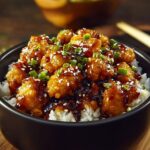 This Sesame Chicken recipe features crispy fried chicken pieces tossed in a sticky, flavorful Asian-inspired sauce made from soy sauce, honey, sesame oil, and aromatic garlic and ginger. Served with sesame seeds, green onions, white rice, and steamed broccoli, this dish offers a perfect balance of sweet, savory, and tangy flavors with a satisfying crunch.