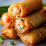 Crispy shrimp egg rolls filled with a savory mix of shrimp, fresh vegetables, and aromatic seasonings, perfect as an appetizer or snack. These egg rolls are deep-fried to golden perfection and served with flavorful dipping sauces like sweet chili, soy sauce, and garlic aioli.