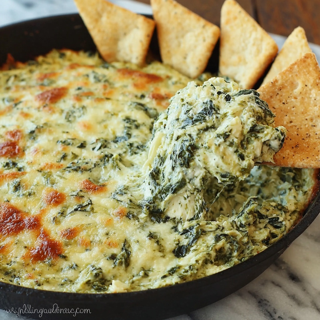 A creamy and cheesy Spinach Artichoke Dip baked to bubbly perfection, combining tender spinach, tangy artichokes, and a rich blend of cheeses. Perfect for parties and gatherings as a warm, savory appetizer served with chips, bread, or vegetables.