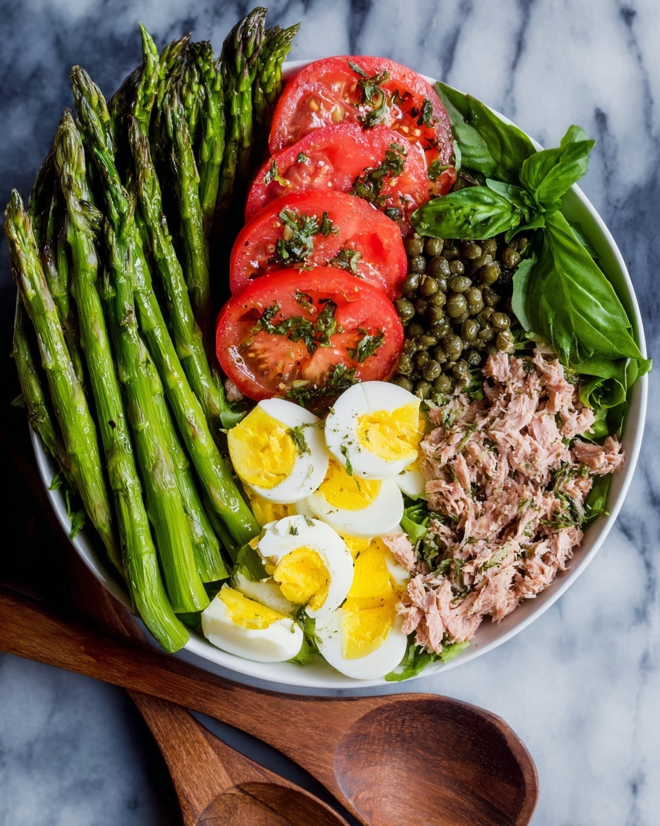 - Assemble the salad: In a large bowl, toss the cooled asparagus, green beans, tuna, tomatoes, capers, and herbs with the dressing until evenly coated. Gently sprinkle the chopped eggs on top. Season with salt and pepper to taste if desired.