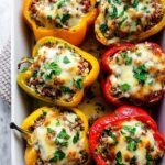 This delicious stuffed peppers recipe features bell peppers roasted until tender and filled with a flavorful mixture of ground beef, spinach, fire-roasted tomatoes, and cooked rice, all topped with melted Monterey Jack or cheddar cheese. It’s a satisfying and wholesome meal perfect for a family dinner.