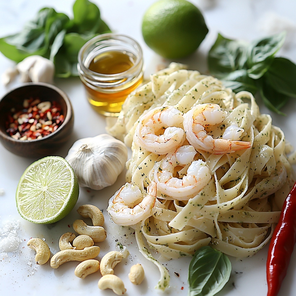 Gathering the right ingredients is the first step to making your Thai Shrimp Basil Pesto Pasta Recipe shine. Each element plays a crucial role—fresh basil and garlic build the aromatic base, while lime juice and fish sauce bring authentic Southeast Asian zest. The roasted cashews ensure a creamy texture without the need for heavy cream, and juicy shrimp rounds it all out with satisfying protein.