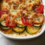 This Tomato Zucchini Casserole is a delicious layered vegetable bake perfect for a healthy, comforting meal. Featuring fresh zucchini, ripe tomatoes, sautéed onions and garlic, and a blend of mozzarella and Parmesan cheeses, it’s topped with a buttery breadcrumb crust for added texture and baked to golden perfection.