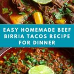 Authentic traditional Mexican Birria Tacos feature tender, slow-cooked beef chuck roast simmered in a flavorful blend of dried guajillo, ancho, and pasilla chilies, along with aromatic spices and fresh ingredients. Served in warm corn tortillas with optional cilantro and lime, these tacos offer a rich, smoky, and slightly spicy taste true to Mexican cuisine.