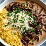A creamy, comforting Vegan Beef Stroganoff featuring plant-based ground beef, sautéed mushrooms, onions, and a rich sour cream sauce served over tender pasta. This hearty vegan twist on the classic stroganoff is perfect for a satisfying family dinner.