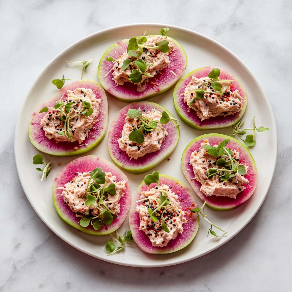 Arrange the Watermelon Radish Tuna Bites Recipe on a sleek slate tray or a rustic wooden board for an eye-catching display. Try stacking a couple of radish slices with alternate layers of tuna and microgreens for mini towers that wow guests. Adding edible flowers as accents can elevate presentation for special occasions.